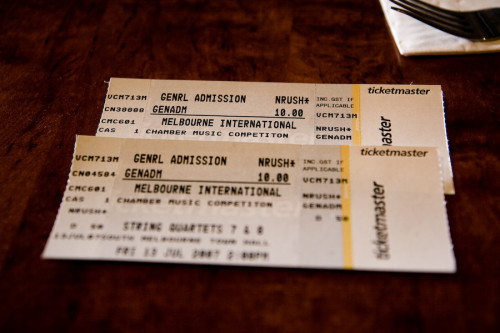 I had been listening to the competition on ABC classic FM but it hadn’t occurred to me to actually go along until my friend Andrew Wee emailed me with the idea. Being a fan of string quartets, I decided that the Friday afternoon session would be a good one to attend. We arrived at the town hall with 20 minutes to spare and purchased our student rush tickets for the very reasonable amount of $10. Then we realised that we hadn’t eaten, so rushed off to have a very quick lunch.