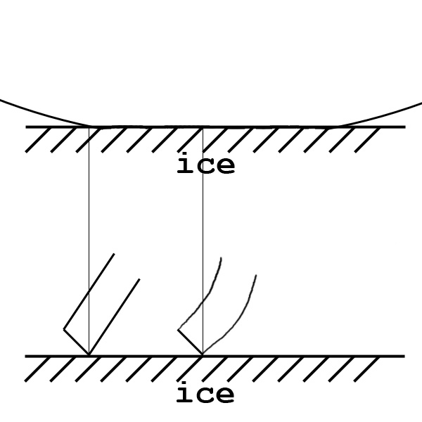 As can be seen from the diagrams above, when directly upright, there is little functional diference between an inline wheel and an ice blade. When force is applied on a wheel towards the ground (like when you stand on your skates) the wheel deforms and a larger section of wheel is in contact with the ground, giving you more grip. Putting more force on an ice blade while upright will deform the metal, but much more slightly, almost imperceptibly. It is easy to see how harder wheels would roll for longer than softer wheels, as they would deform less, and less rolling energy would be wasted in changing the shape of the wheel.